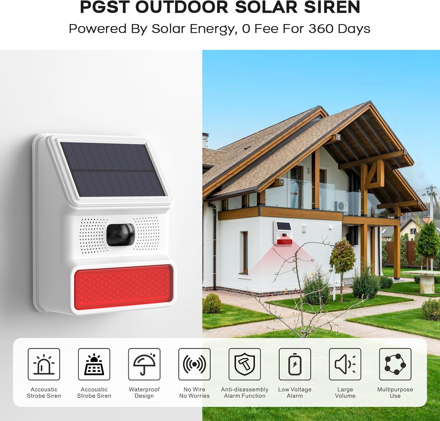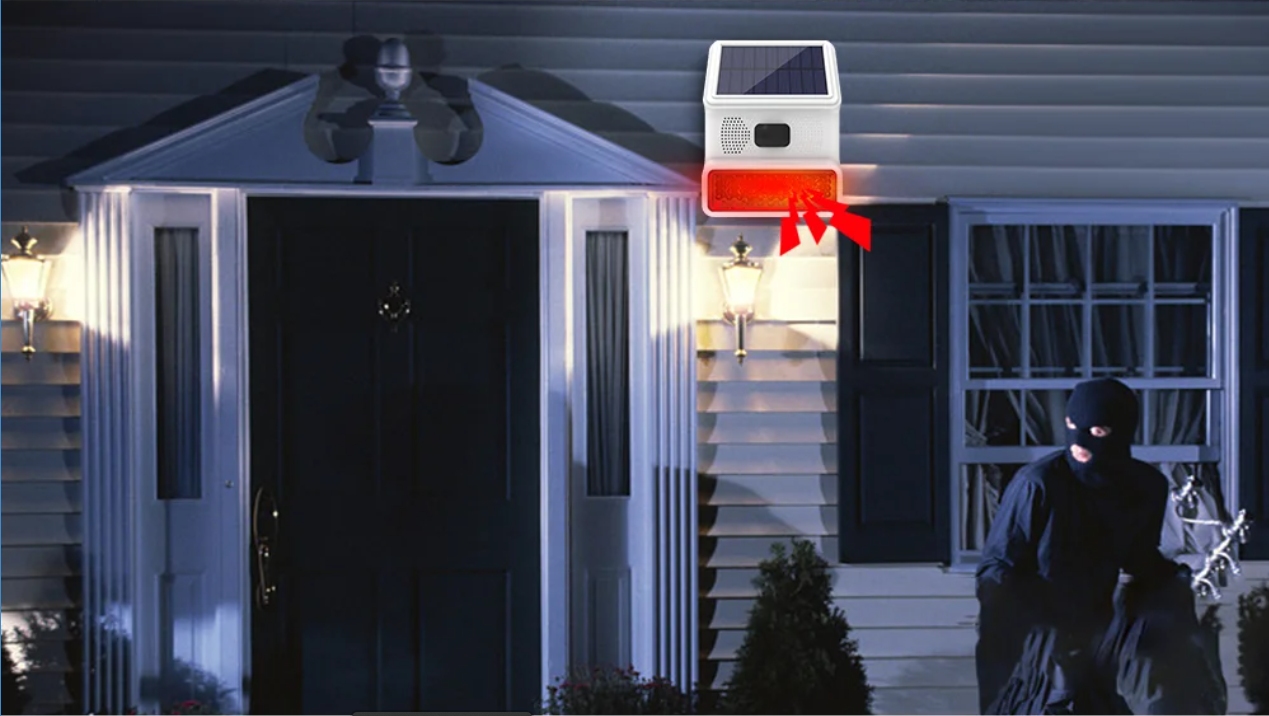 Most outdoor solar alarms blast 100–120 dB sirens with flashing lights the moment motion is detected